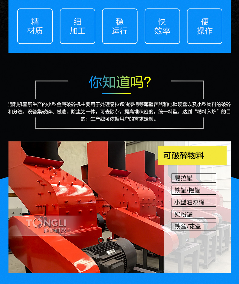 河南通利8010金属破碎机由主机一台,生产线一条,磁设备一台,输送机一台,电机一台组成,厂家可为您提供系列化的金属破碎机和整个破碎工厂的工艺装配配置。用于破碎轻薄料如汽车外壳混合废金属,包括金属打包块的破碎,机器通过不断、化以及经验的积累,掌握了设计和制造金属破碎机的技术诀窍,从而设备长期可靠地低成本运行。