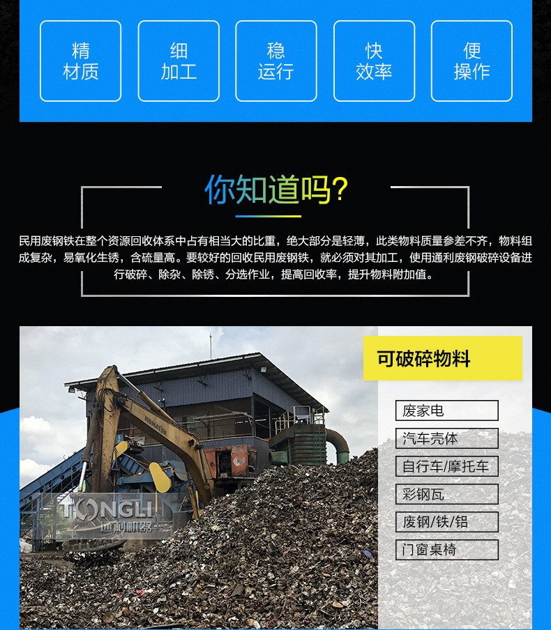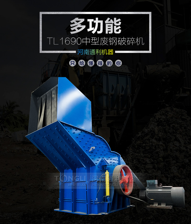 河南通利1690金属破碎机由主机一台,生产线一条,磁设备一台,输送机一台,电机一台组成,厂家可为您提供系列化的金属破碎机和整个破碎工厂的工艺装配配置。用于破碎轻薄料如汽车外壳混合废金属,包括金属打包块的破碎,机器通过不断、化以及经验的积累,掌握了设计和制造金属破碎机的技术诀窍,从而设备长期可靠地低成本运行。