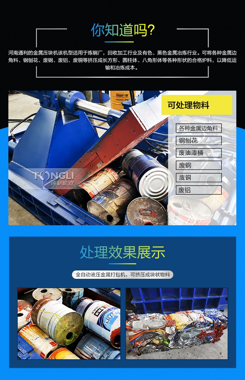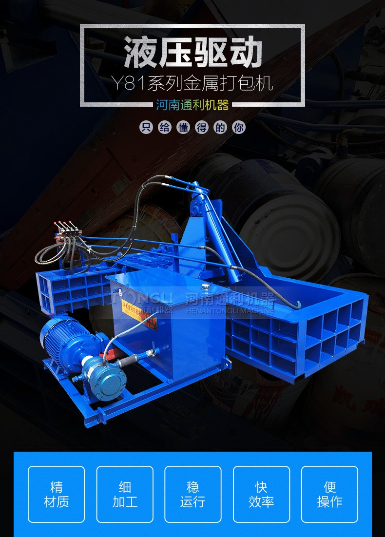 金属打包机主要应用于回收加工行业及金属冶炼行业。可将各种金属边角料、钢刨花屑、废钢、废铁、废铜、废铝、铝刨花屑、解体汽车壳、废油桶等金属原料挤压成长方体。便于储藏、运输及回炉再利用。