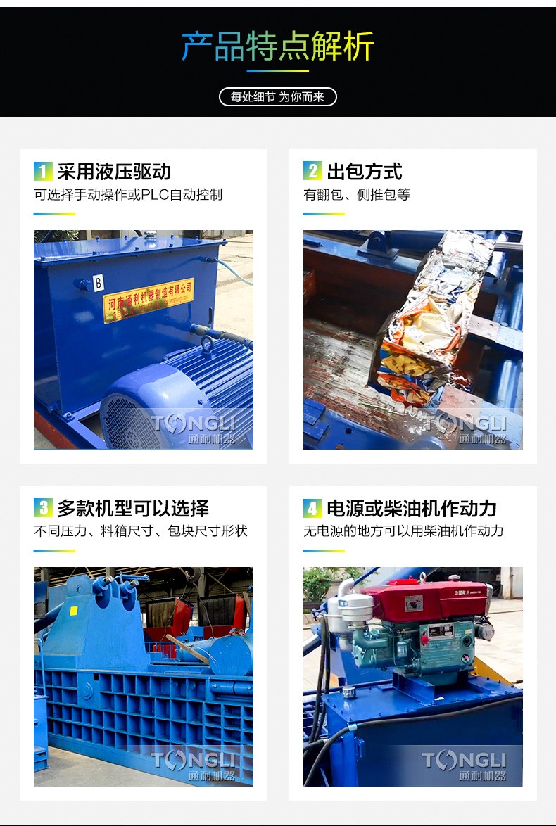• A:机器采用液压传动、结构紧凑、移装方便、操作简单、维修容易、密封可靠、安装时不用底脚螺丝。用户可根据需要自定打包规格、尺寸,以较限度地配合运输或存储,压块后金属方便破碎二次处理,是提劳动效率、减少劳动强度、节约人力、减少运输费用的设备。